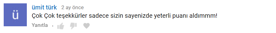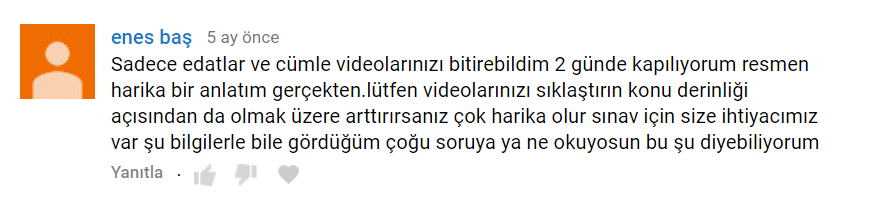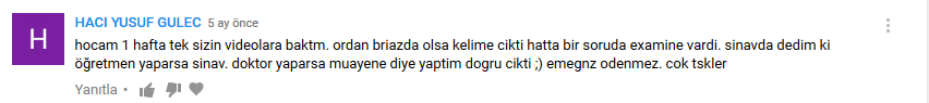 Ekim 2020 de ydstime a bu sistemle başarı elde eden bir arkadaşımın tavsiyesiyle üye olduğumda gerçekten İngilizcede sıfırdım ve am is are bile bilmiyordum yökdil sınavı önüme gelse kalem dahi oynatamaz haldeydim ama üye olduktan sonra bu süreç adeta karanlık bir odada bocalayan birinin ışığın yanmasıyla önünü rahatça görmesi kabilinden Yunus Hoca odanın ışığını yaktı ve çok rahat bit süreç geçirdim Yunus Hocanın ödevlendirmesi ve takipleri ve anlatımınının kalitesiyle sınava yakında bilhassa Yunus hocanın denemelerini çözmek ve anlatımlarını dinlemek çok önemli ve 0 dan başladığım Yökdil sürecim 28 şubatta 2021 yökdil 78,75 puanla neticelendi.Tekrardan değerli hocalarıma teşekkür ediyorum.