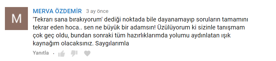 Mezun senemle nasıl baş edebileceğimi düşünürken bir anda kendimi ders videolarını izlerken bulduğum sistem. Rehberlik, kaynaklar, canlı dersler, sistem içeriği, ders programları.... ve belki de sayamadığım daha nice şey. Her şey sizin için düşünülmüş ve size sadece ders çalışmak, programa uymak, derslere katılmak kalıyor. Süre içerisinde her şekil destek bulduğunuz bir yer. Yunus hocaya ve Yusuf hocaya bu süreçte yanımda oldukları için çok teşekkür ediyorum. İyi ki tanımışım, iyi ki katılmışım.