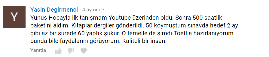 Hayatimda aldigim ilk ve tek dogru karar yunus hocadan ders almakti.. İngilizceyi severek öğrenmek istiyorsaniz dogru adrestesiniz. İyi ki varsin ydstime.