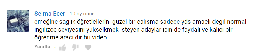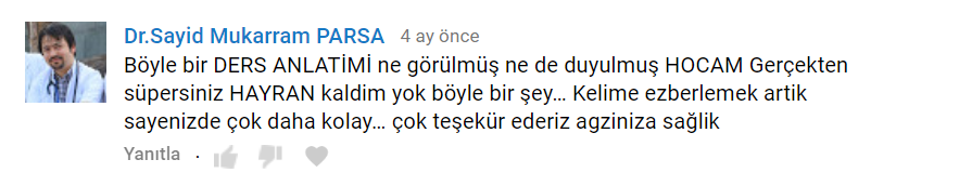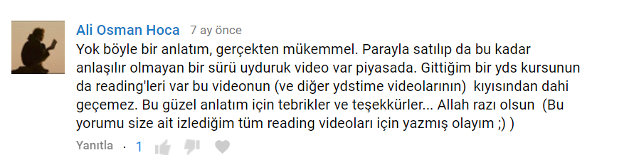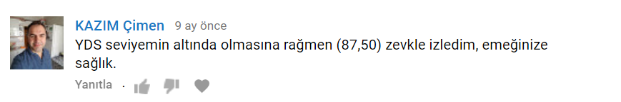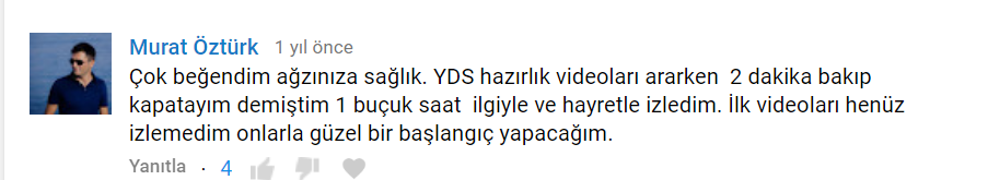 İki yıl kadar uzun bir süre kullanmış olduğum ve mevcut tüm içeriğiyle İngilizce seviyeme çok şey kattığına inandığım muhteşem bir eğitim paketi . Gerek genel İngilizcesini gelistirmek isteyen,gerekse akademik kariyer yolculuğunda İngilizceye ihtiyaç duyan herkese gönül rahatlığı ile tavsiye edebileceğim bir online eğitim sitesi. Kendilerini önce örnek videoları üzerinden dinleyip,sonrasında sistemin tamamına ulaştığımda umduğumdan fazlasını bulduğum ve kendilerini dinlemekten ve tanımaktan büyük bir mutluluk duyduğum Değerli Yunus Hocam böylesine kaliteli bir eğitim sitesine evimin rahatlığında, her an her yerde,ulaşabildiğim için kendimi şanslı hissediyor ve size sonsuz teşekkürler ediyorum.İngilizce alanındaki farkınızı ancak sizi tanıyanlar bilir diyerek sözü kısa tutuyor ve YOU ARE THE BEST,.....diyorum. Tüm YDSTIME ailesine sevgiler, saygılar .